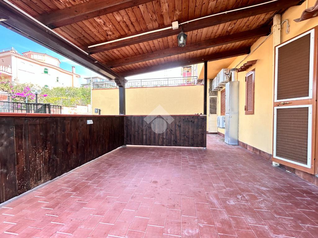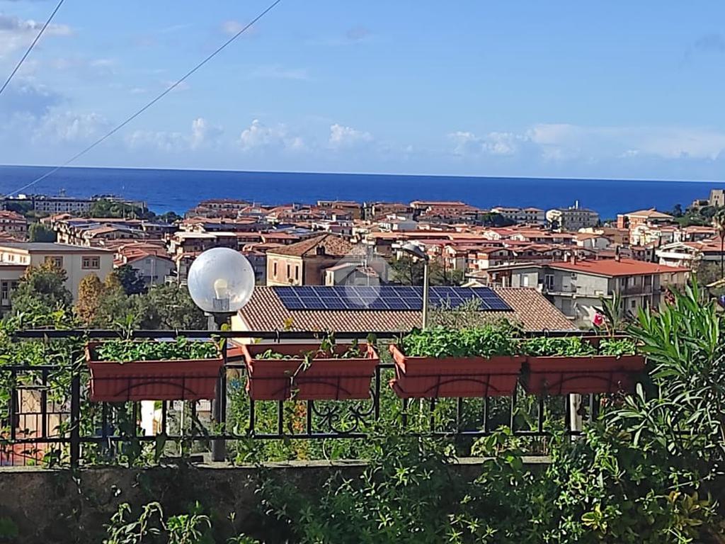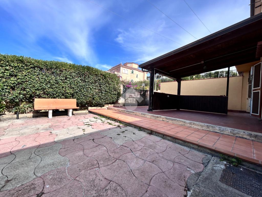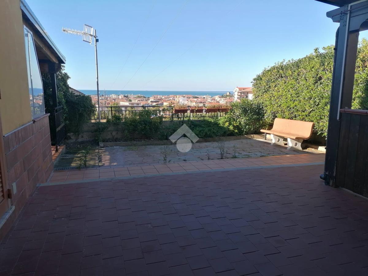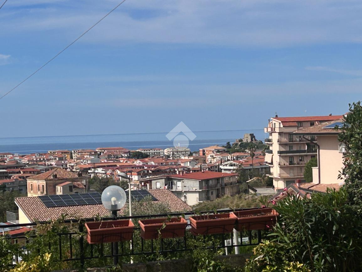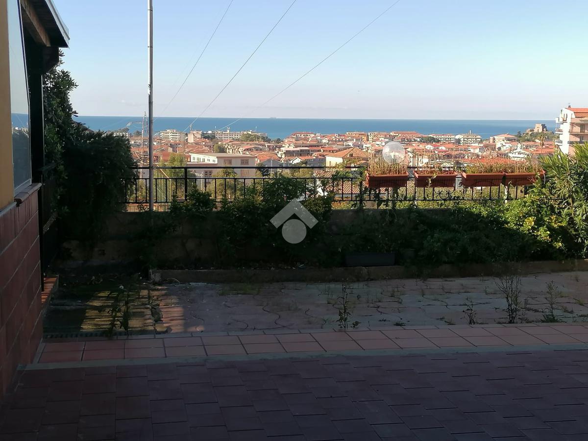Scalea, via Sandro Pertini, appartamento al piano terra, di 86 mq interni, con ingresso indipendente composto da: corte angolare di 80 mq di proprietà esclusiva, attrezzata con doccia esterna e lavabo, con possibilità di parcheggiare l'auto all'interno; sala con angolo cottura, 3 camere e 2 bagni. Impianto GPL per l'acqua calda. Impianto elettrico nuovo. Climatizzato. Posto auto assegnato. A circa 2 km dal mare.