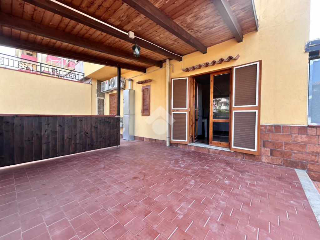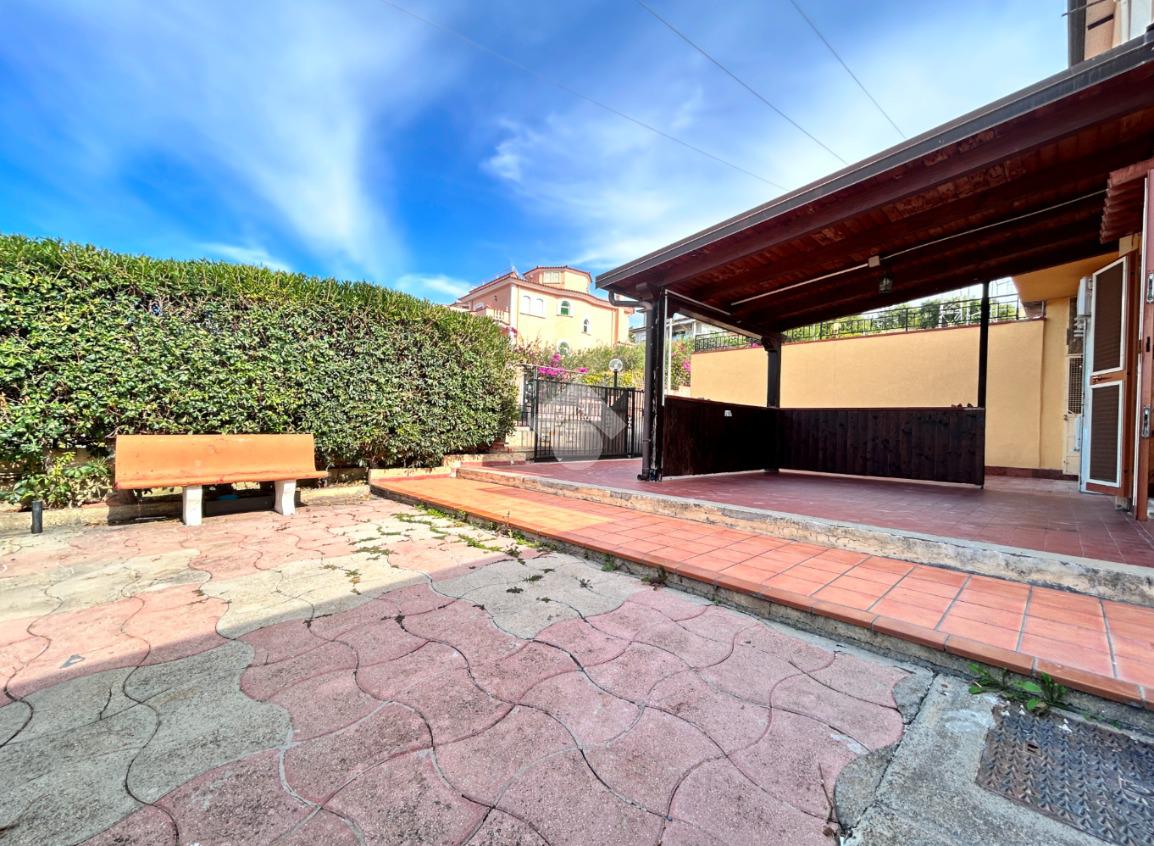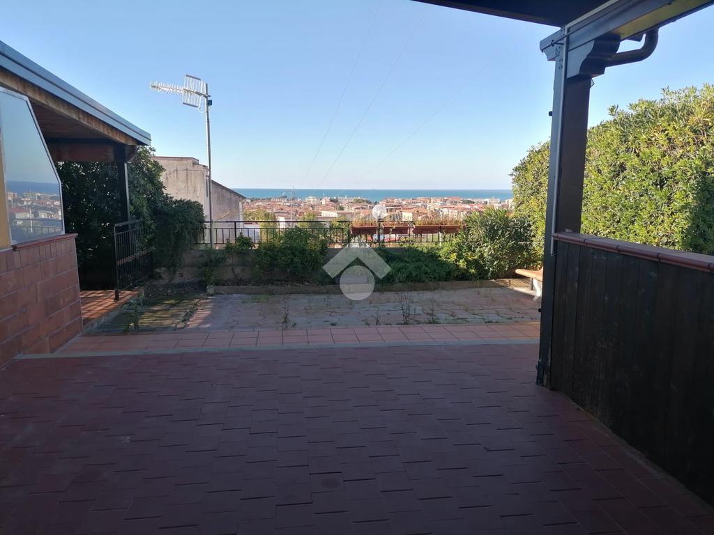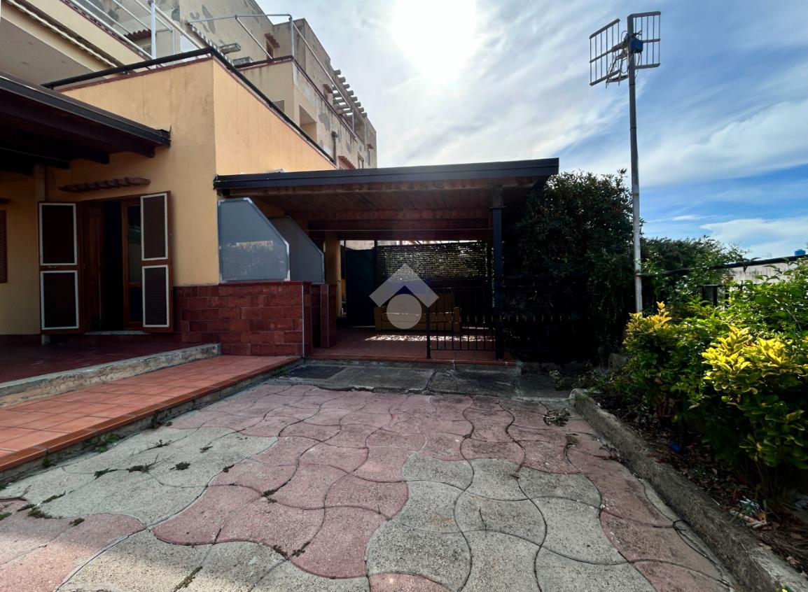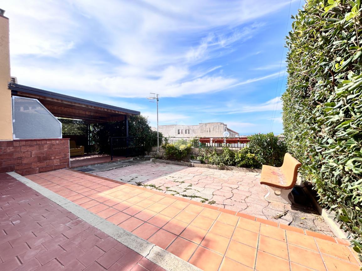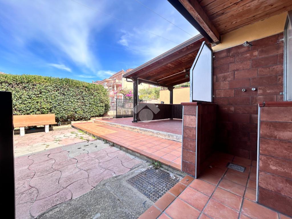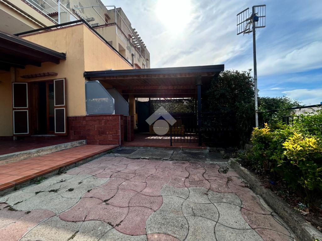 Scalea, via Sandro Pertini, appartamento al piano terra, di 86 mq interni, con ingresso indipendente composto da: corte angolare di 80 mq di proprietà esclusiva, attrezzata con doccia esterna e lavabo, con possibilità di parcheggiare l'auto all'interno; sala con angolo cottura, 3 camere e 2 bagni. Impianto GPL per l'acqua calda. Impianto elettrico nuovo. Climatizzato. Posto auto assegnato. A circa 2 km dal mare.
